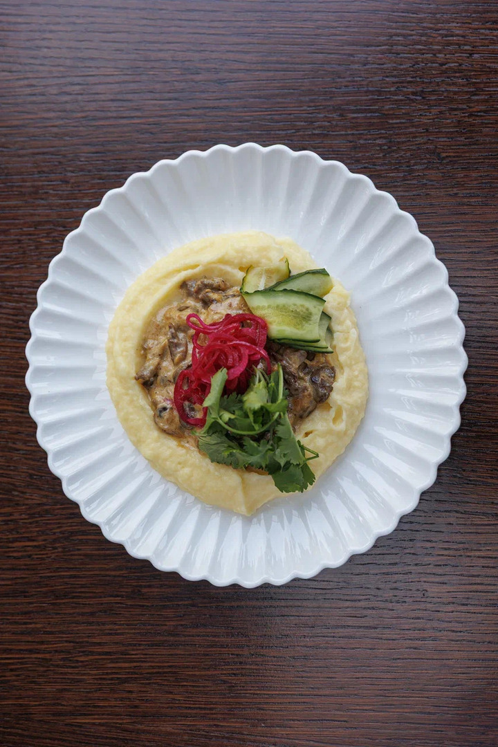 Говяжья вырезка, шампиньоны, лук, сливочный соус и картофельное пюре