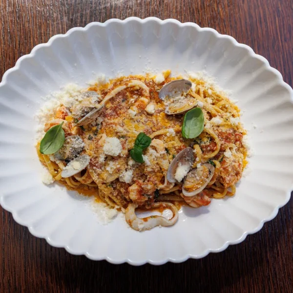 Лингвини с морепродуктами в томатно-базиликовом соусе.