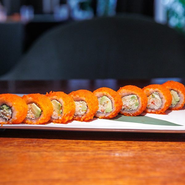 Креветка, авокадо, тобико, лук фри