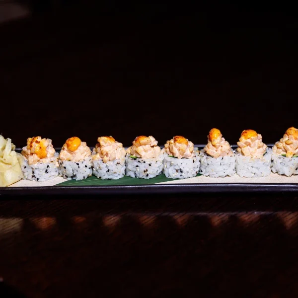 Ролл “Вулкан” с опаленным гребешком и лососем