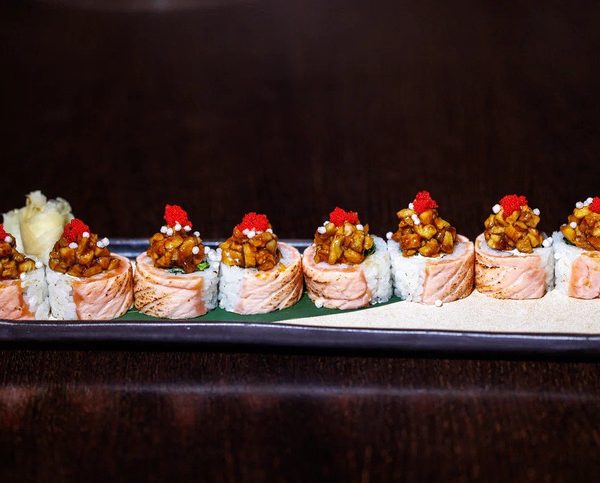 Роллл без риса: опаленный лосось с креветкой темпура и тобико