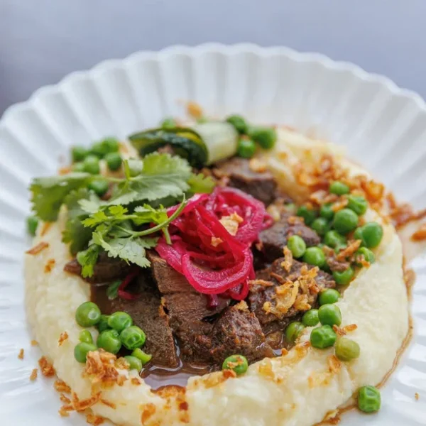 Ризотто с тигровыми креветками, голубыми мидиями, гребешками и легким соусом из свежих томатов.