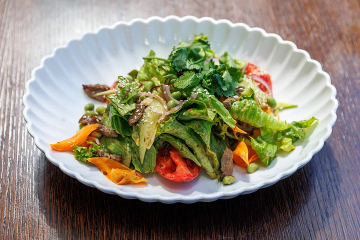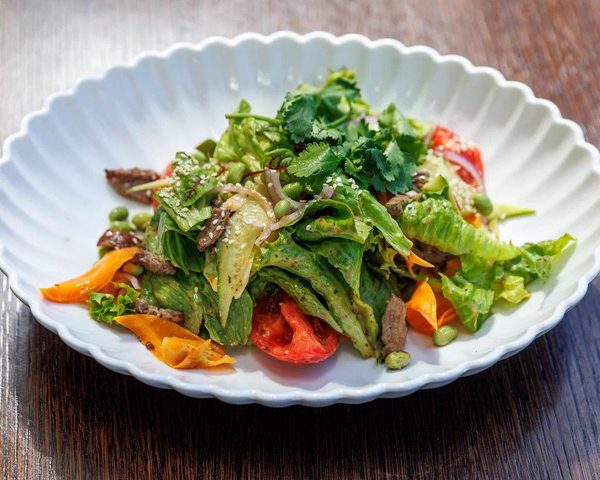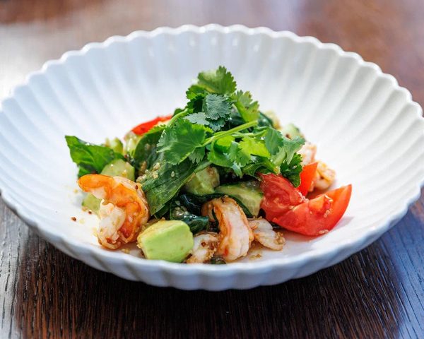 Салат с тигровыми креветками, киноа и авокадо с тайской заправкой.