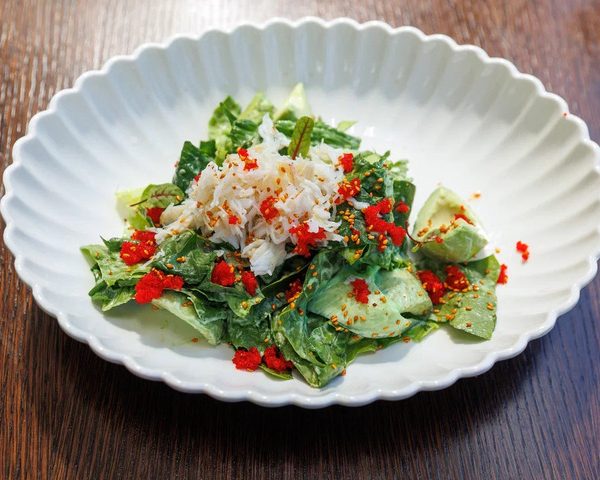 Салат с камчатским крабом, авокадо и соусом васаби.