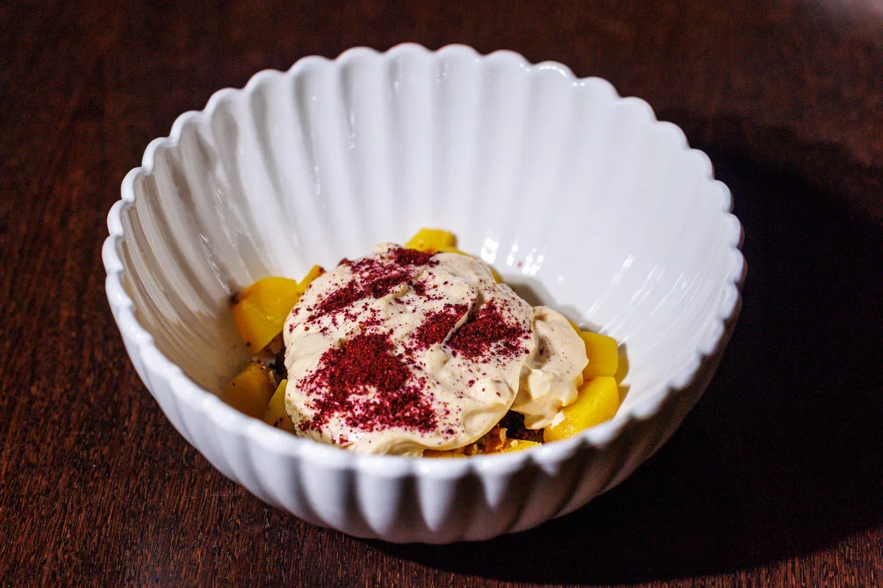 Сметанник с персиками, юдзу и шоколадным брауни