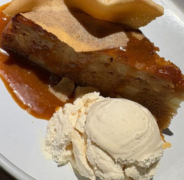 Яблочная шарлотка с коричным соусом и ванильным мороженым