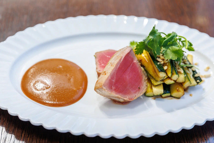 Стейк тунца с ореховым соусом ,цукини.