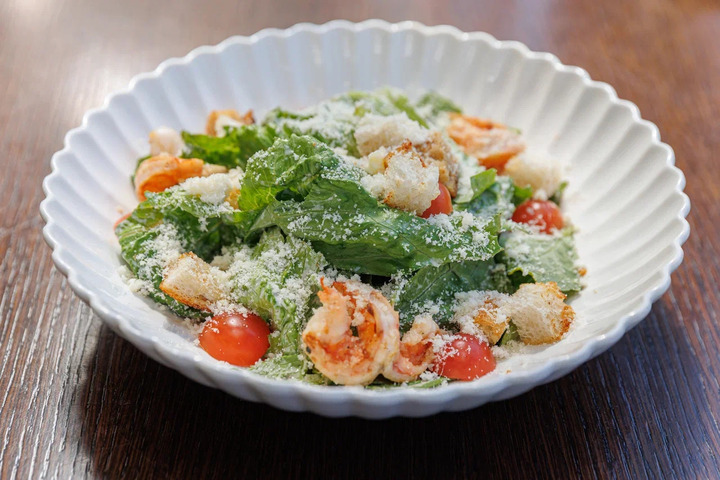 Салат романо, тигровые креветки, домашний соус цезарь, черри, пармезан, тост